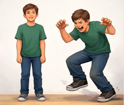 Me: Okay so you’re a 12-year-old human boy living in the present day. Now, I’m not suggesting that all 12-year-old males in 2026 have exactly the same physicality… but you’ll have some things in common that distinguish you from 12-year-old females, or 57-year-old males, or 12-year-old boys from 1853. So who you are in terms of age, species, gender, time period will give us some information about your physicality. But your physicality right now in this room talking to me is different from what it would be listening to music in your bedroom, or sitting outside the headmaster’s office because you’re in trouble. So situation (which affects feelings, moods and thoughts) also needs to be taken into consideration.